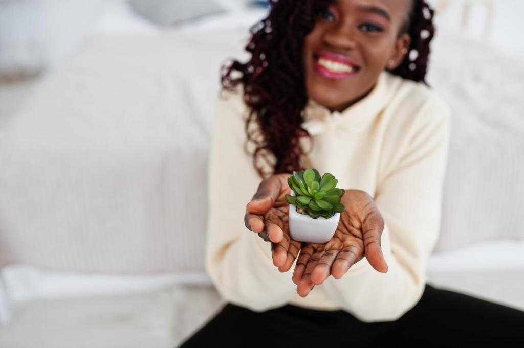 Im Frühling Polster lüften, im Herbst Holz ölen. Luftfeuchtigkeit anpassen, Zugluft vermeiden. Diese saisonalen Rituale gleichen Klimawechsel aus und beugen Rissbildung sowie Verzug bei Holzoberflächen verlässlich vor.